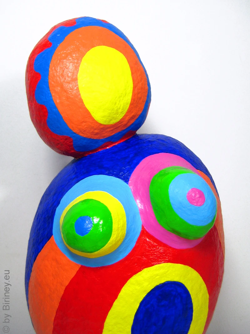 Höhe (inkl. Sockel): ca. 36cm Grundfarbe des Korpus: mehrfarbig Technik: Holzmaché auf Unterbau, modelliert und geschliffen, von Hand bemalt, lichtechte Farben, Oberfläche mit seidenmattem Schutzfirniss versehen. Gewicht ca. 550 Gramm. Sockel: massives Gussmaterial, an der Unterseite mit Schongleitern versehen Signatur: Biriney 2025