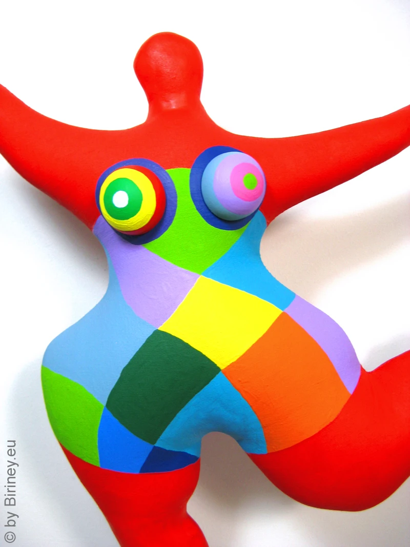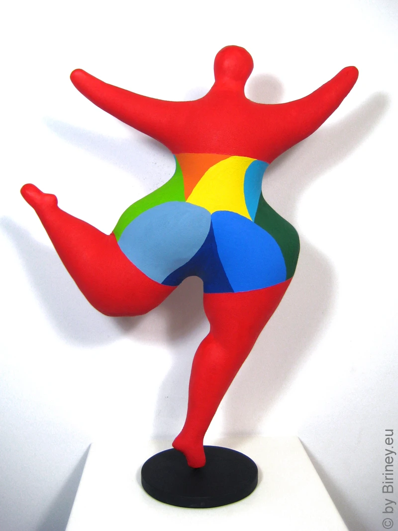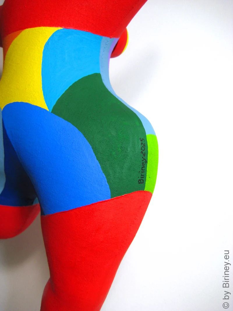 Height (incl. base): approx. 44cm / 17.3 inches Total weight incl. base: approx. 350g Basic color of the body: Brilliant red Technique: super-lightweight design, canvas on base, without wood mâché, completely handcrafted and painted, lightfast colors base: cast material, fitted with protective glides on the underside Signature: right side “Biriney 2025”