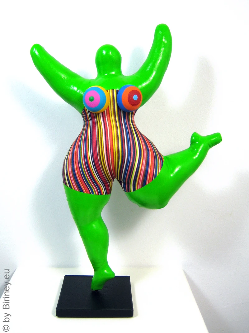Höhe (inkl. Sockel): ca. 34cm Gesamtgewicht: ca. 250g Grundfarbe des Korpus: Apfelgrün Technik: leichte Ausführung, bedrucktes Textil auf Grundkörper, teilweise bemalt, ohne Holzmaché, vollständig in Handarbeit gefertigt, lichtechte Farben Sockel: Gußmaterial, an der Unterseite mit Schongleitern versehen Signatur: Unterseite "Biriney 2025"