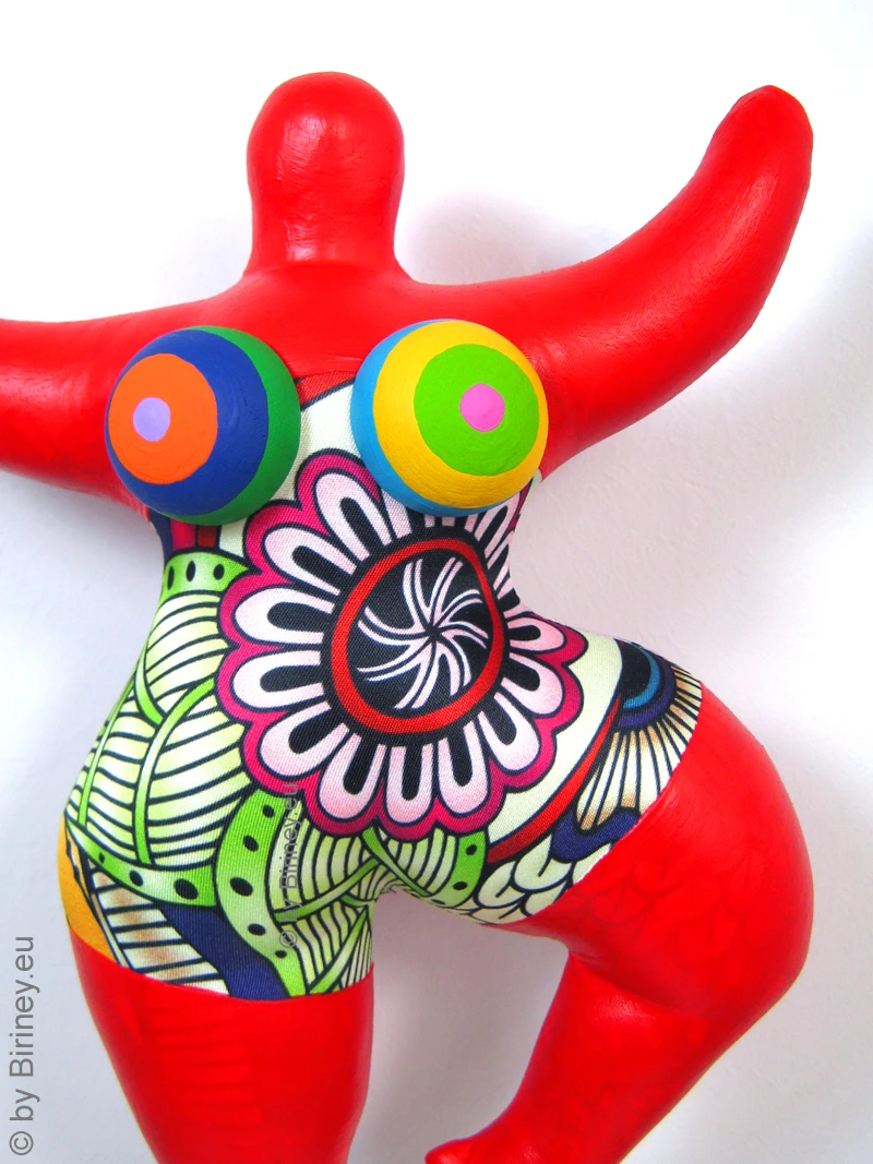 Höhe (inkl. Sockel): ca. 34cm Gesamtgewicht: ca. 250g Grundfarbe des Korpus: Rot Technik: superleichte Ausführung, bedrucktes Textil auf Grundkörper, teilweise bemalt, ohne Holzmaché, vollständig in Handarbeit gefertigt, lichtechte Farben Sockel: Gußmaterial, an der Unterseite mit Schongleitern versehen Signatur: Unterseite "Biriney 2025"