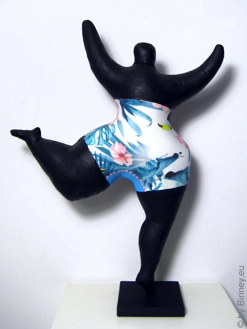 Höhe (inkl. Sockel): ca. 40cm Gesamtgewicht: ca. 260g Grundfarbe des Korpus: Schwarz Technik: superleichte Ausführung, bedrucktes Textil auf Grundkörper, teilweise bemalt, ohne Holzmaché, vollständig in Handarbeit gefertigt, lichtechte Farben Sockel: abnehmbar, Gußmaterial, an der Unterseite mit Schongleitern versehen Signatur: Unterseite "Biriney 2025"